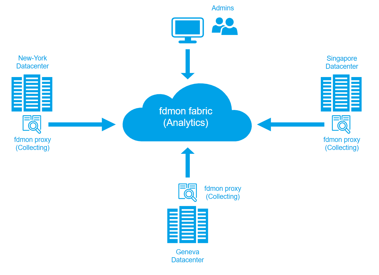 Traffic between your data-centers and fdmon cloud is secured, deduplicated and compressed. Bandwidth required between your data-centers and fdmon cloud is absolutely negligible (1 MB/s for 20’000 monitored servers/equipments and 50’000’000 metrics updated every minute).