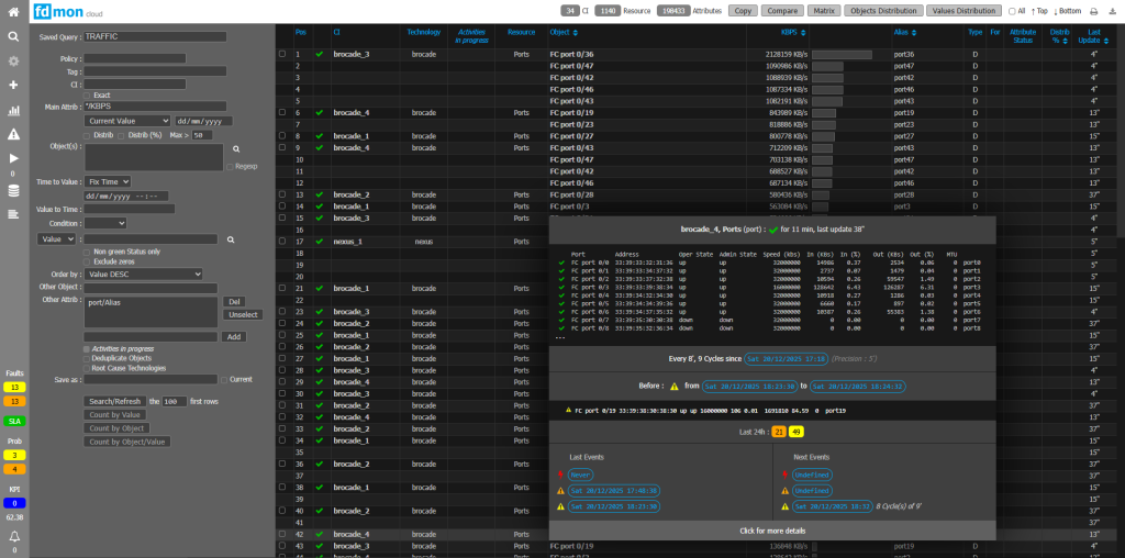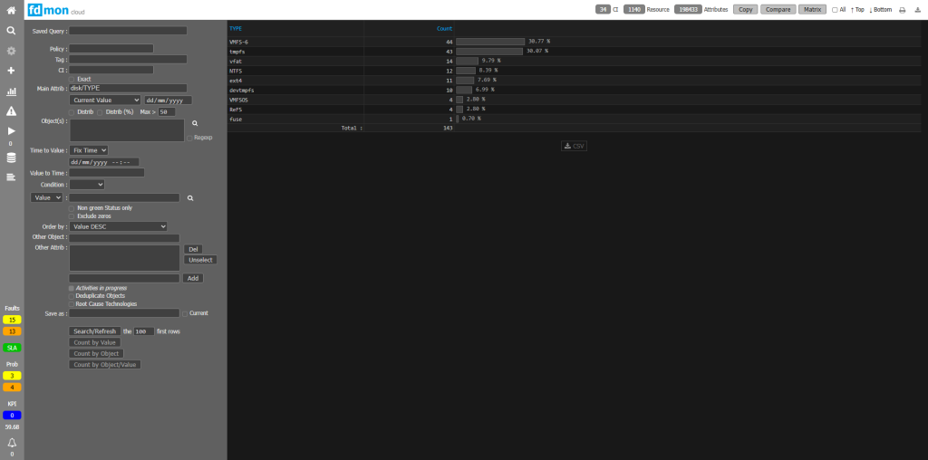 A query in the fdmon Augmented Inventory can target the current value, predicted value, statistics or cardinality of any object attribute for a CI, a group of CI, a site or your overall IT ecosystem.