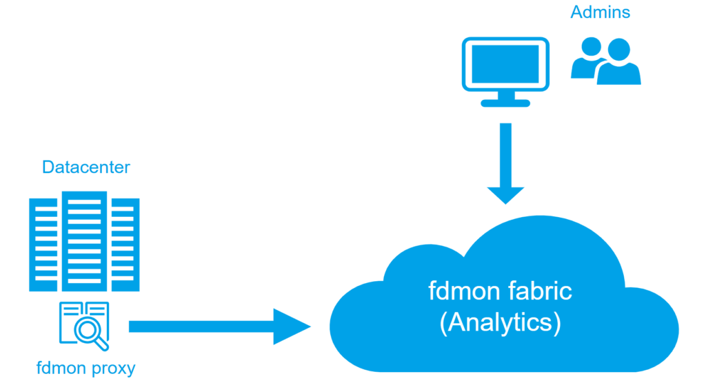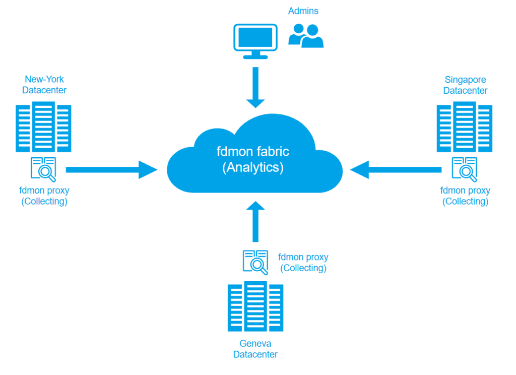 Interactions between fdmon and managed infrastructures or applications are centralized in a Proxy server in charge of collecting information and metrics, then sending them to the fdmon platform.